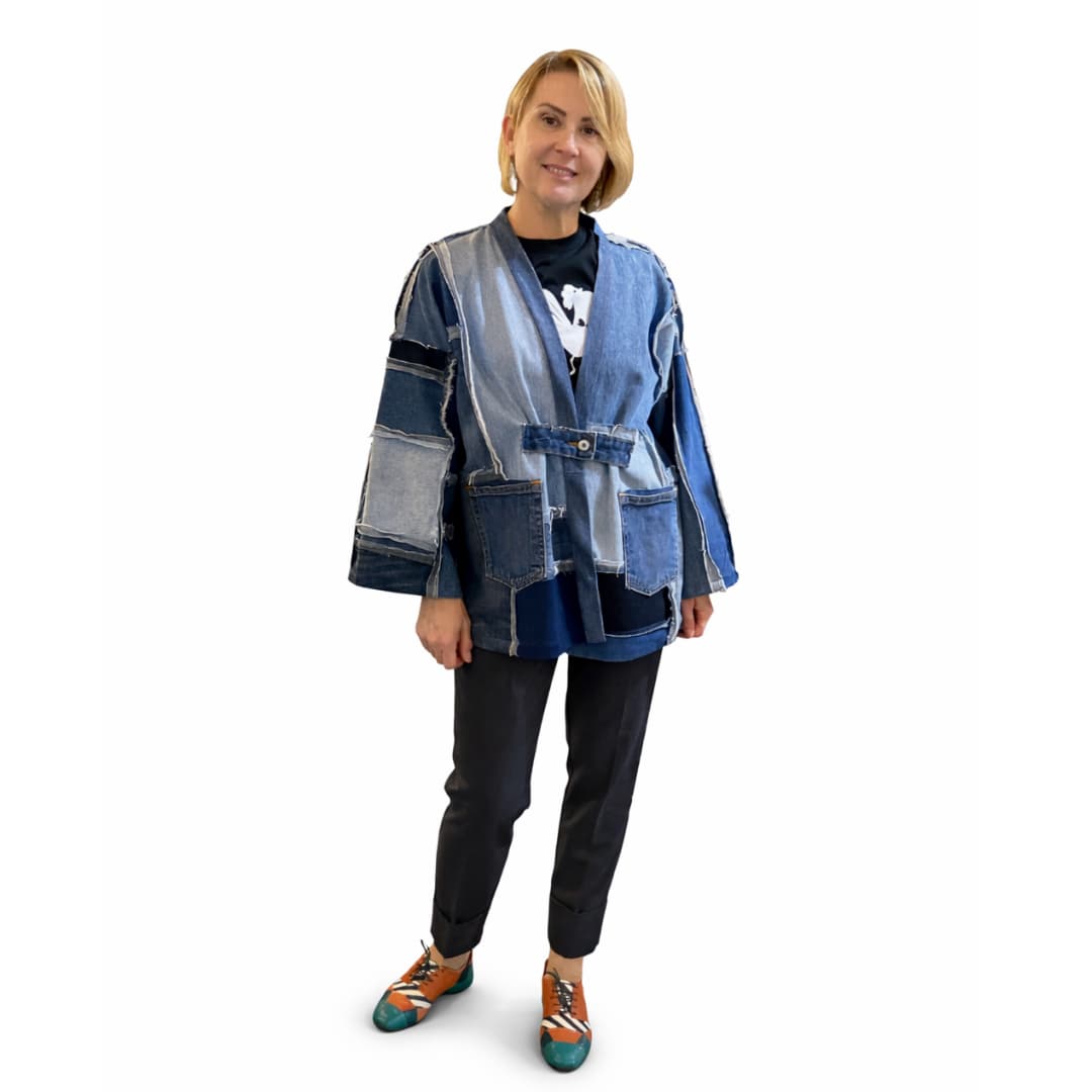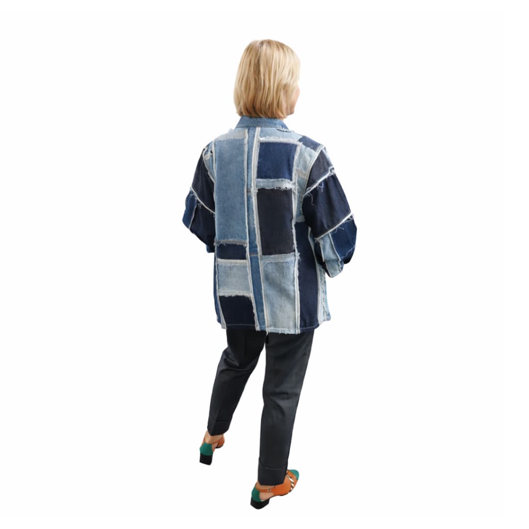 Tegu on patchwork-stiilis jakiga, mis on valmistatud erinevatest taaskasutatud teksakangastest. Kangatükid on eri toonides – alates heledast kuni tumeda siniseni – ning need on kokku õmmeldud nähtavate õmblustega, mis annavad jakile robustse ja kunstilise ilme. Iga detail on veidi erinev, mis muudab iga jaki ainulaadseks.