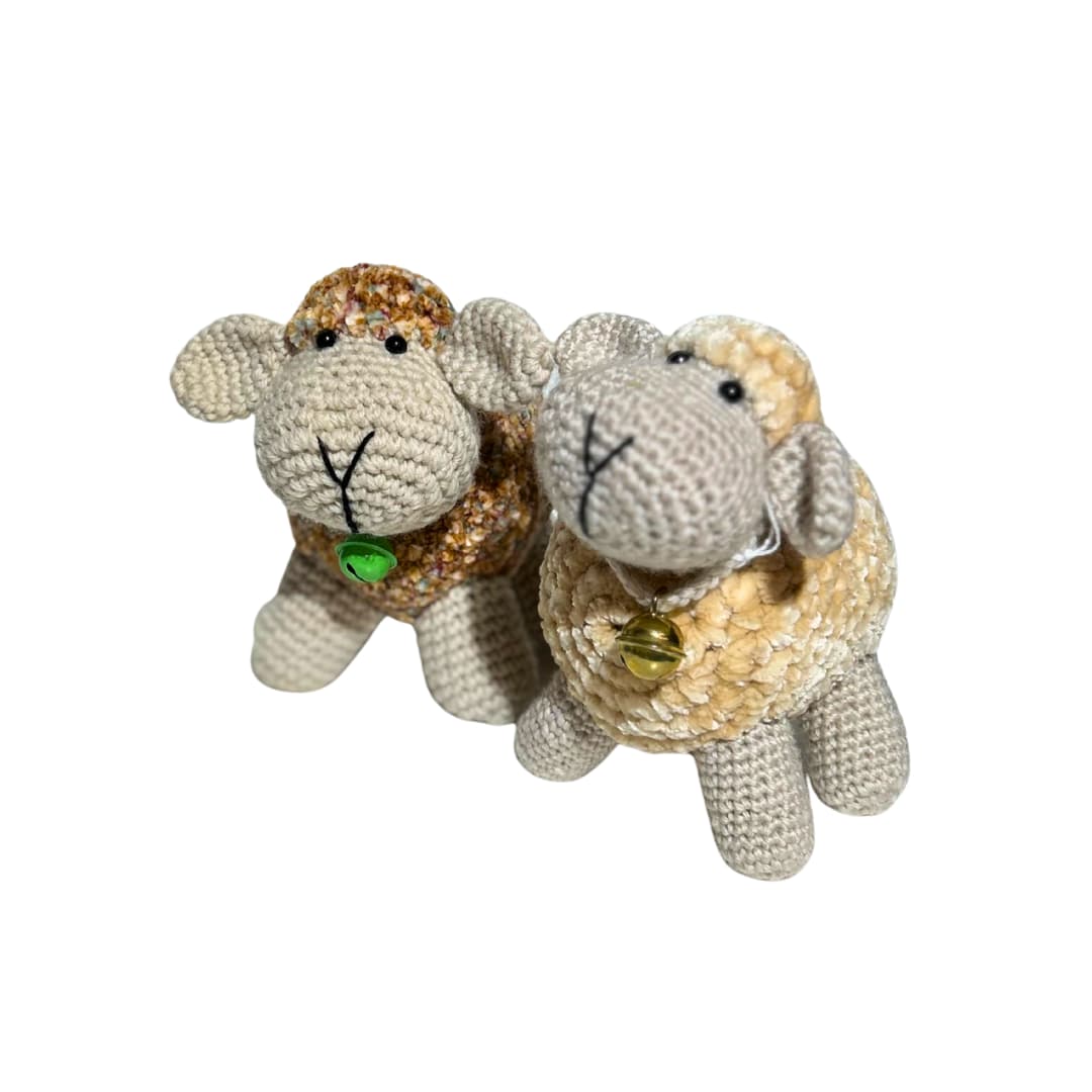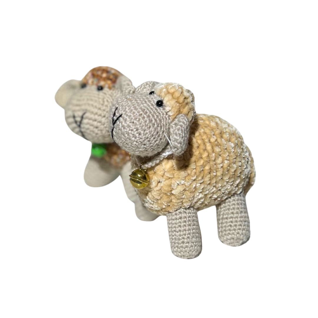 Lambakese keha on valmistatud kirjust lõngast, mis annab talle omanäolise ja sooja välimuse, ning detailid – silmad, kõrvad ja koon – on hoolikalt viimistletud. Väike kuldne kaelakee lisab armsa iseloomuliku aktsendi.
