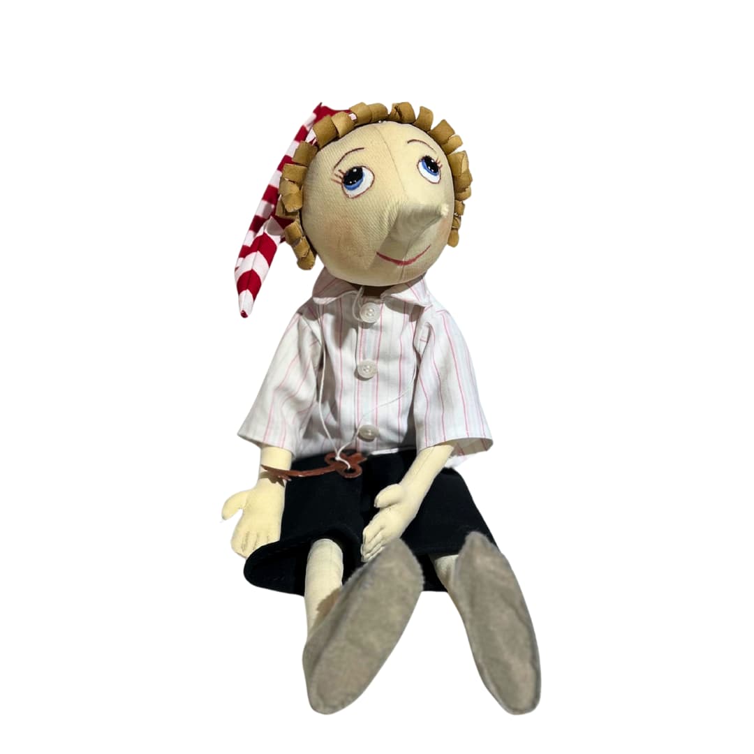 Käsitööna valminud nukk – Buratino – See armas käsitsi valmistatud tekstiilnukk kujutab tuntud ja armastatud muinasjututegelast Buratino. Pikalt ninaga, sõbraliku ilme ja vallatu olekuga tegelane viib mõtted lapsepõlve lugude ja fantaasiarikaste seikluste juurde. Buratino klassikaline riietus – triibuline särk, tumedad püksid ja punase-valgekirju müts – loob äratuntava ja ajatu välimuse.