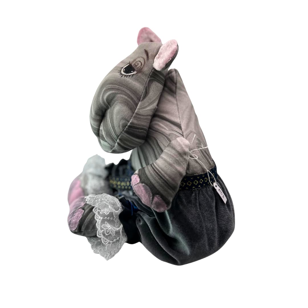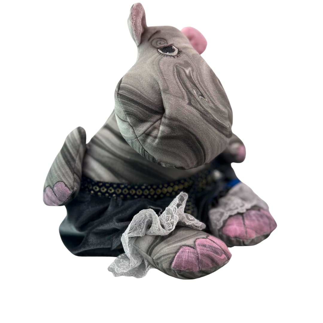 Detailideni viimistletud rõivastus: Jõehobu kannab stiilset tumesinist pitsiga kaunistatud seelikut, mida ehib peen kuldne vöödetail. Tema jalgu kaunistavad õrnad valged pitsist satsid, mis lisavad ohtralt naiselikkust ja elegantsi.