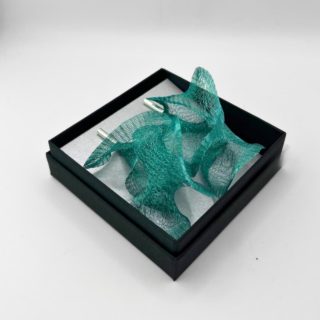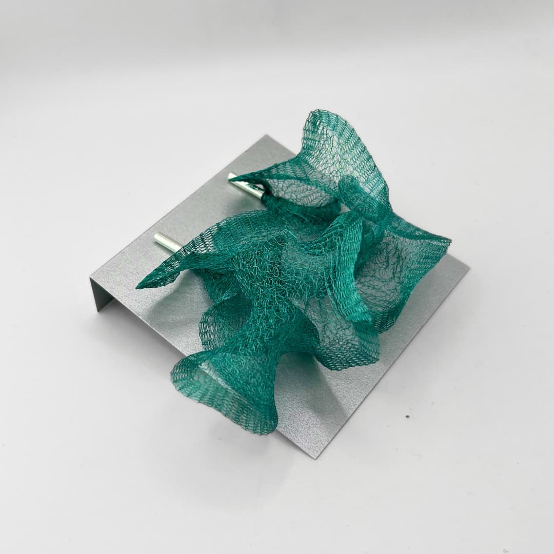 Kõrvarõngad on valmistatud läbikumavast, võrkjast materjalist, mis on vormitud lainetavaks ja orgaaniliseks kujuks – justkui merevetikad või veealused lained. Toon on sügav türkiissinine/mereroheline, mis püüab pilku, kuid jääb samas elegantseks ja rahulikuks.