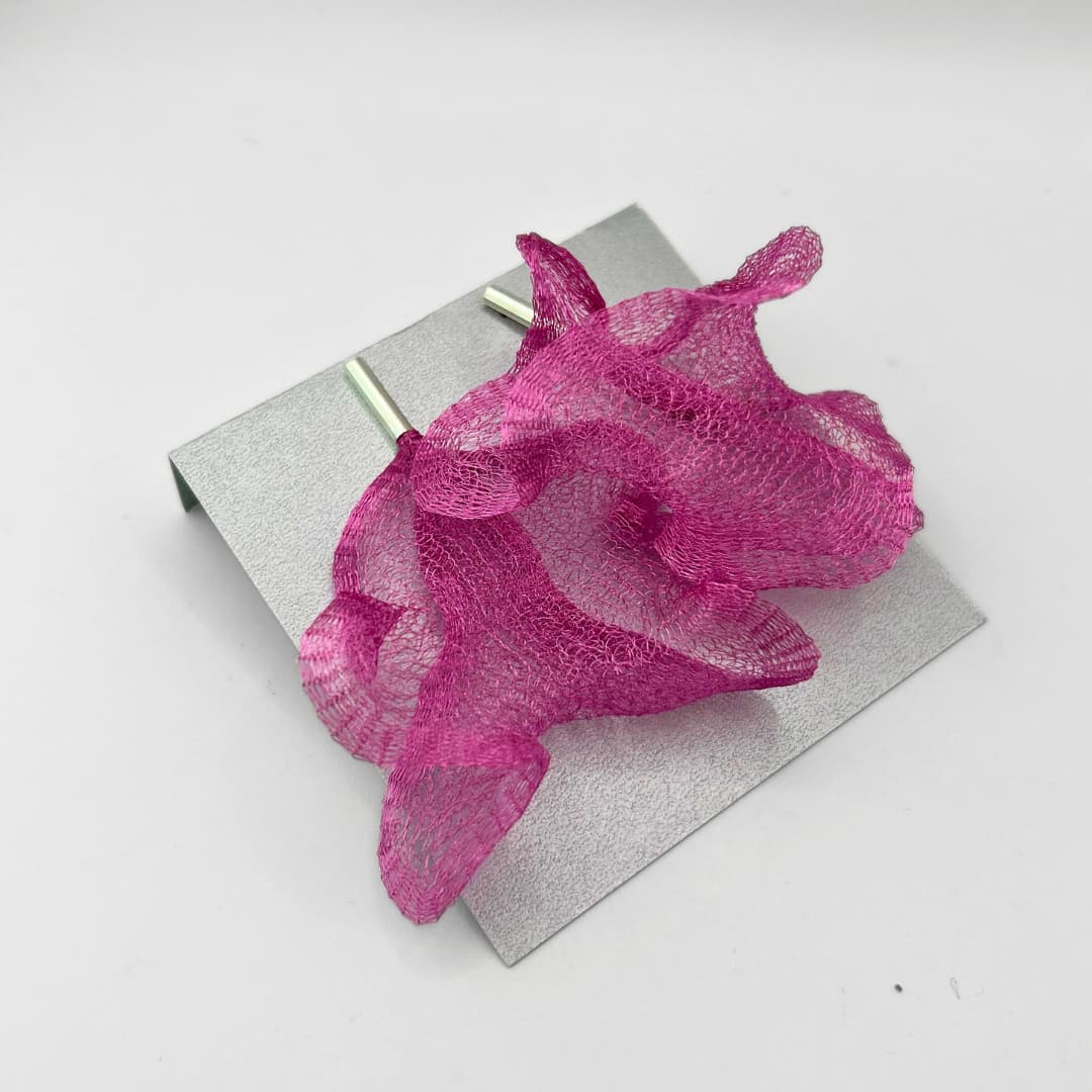 Kõrvarõngad on valmistatud läbikumavast, võrkjast materjalist, mis on vormitud lainetavaks ja orgaaniliseks kujuks – justkui merevetikad või veealused lained. Toon on sügav roosa, mis püüab pilku, kuid jääb samas elegantseks ja rahulikuks.