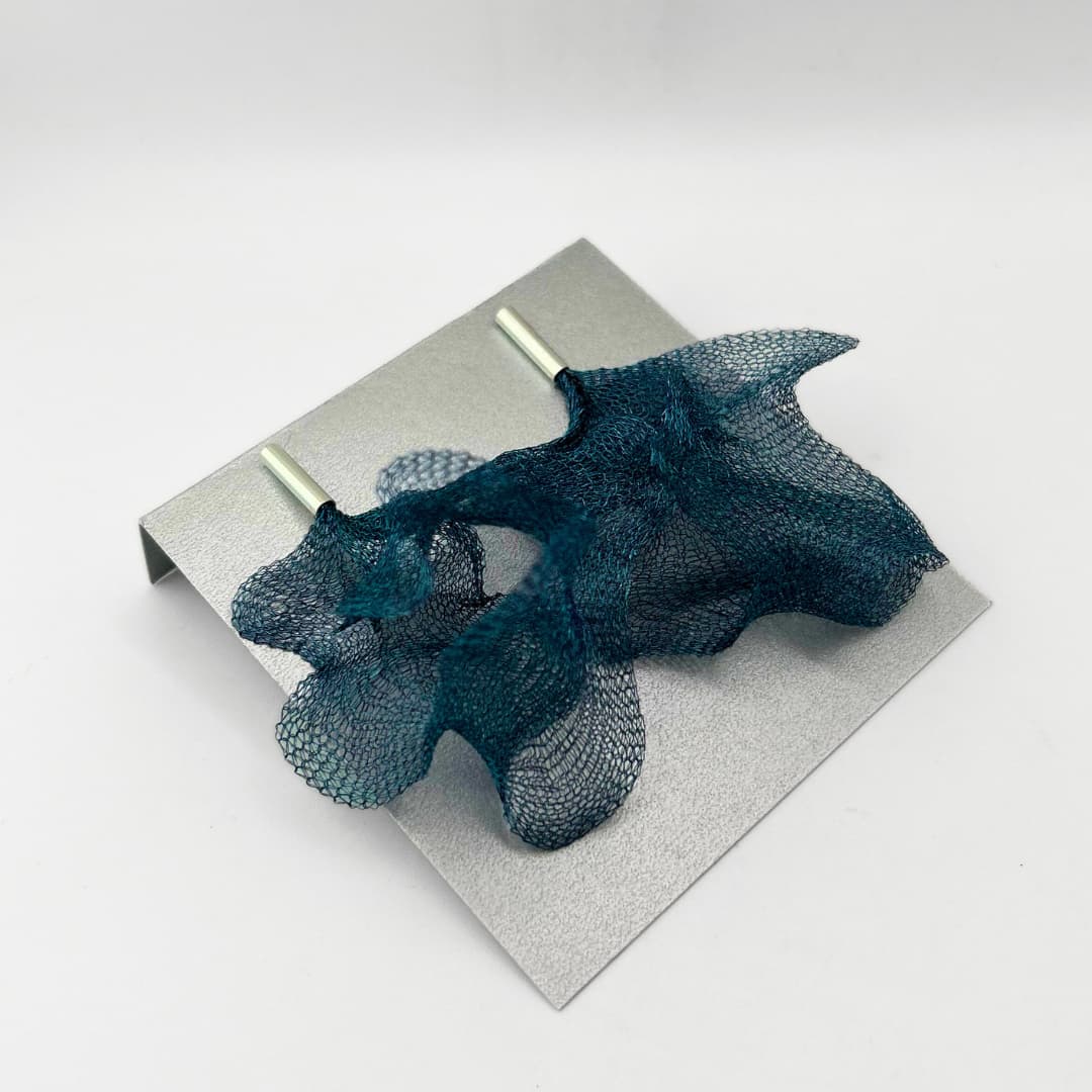 Kõrvarõngad on valmistatud läbikumavast, võrkjast materjalist, mis on vormitud lainetavaks ja orgaaniliseks kujuks – justkui merevetikad või veealused lained. Toon on sügav sinakas, mis püüab pilku, kuid jääb samas elegantseks ja rahulikuks.