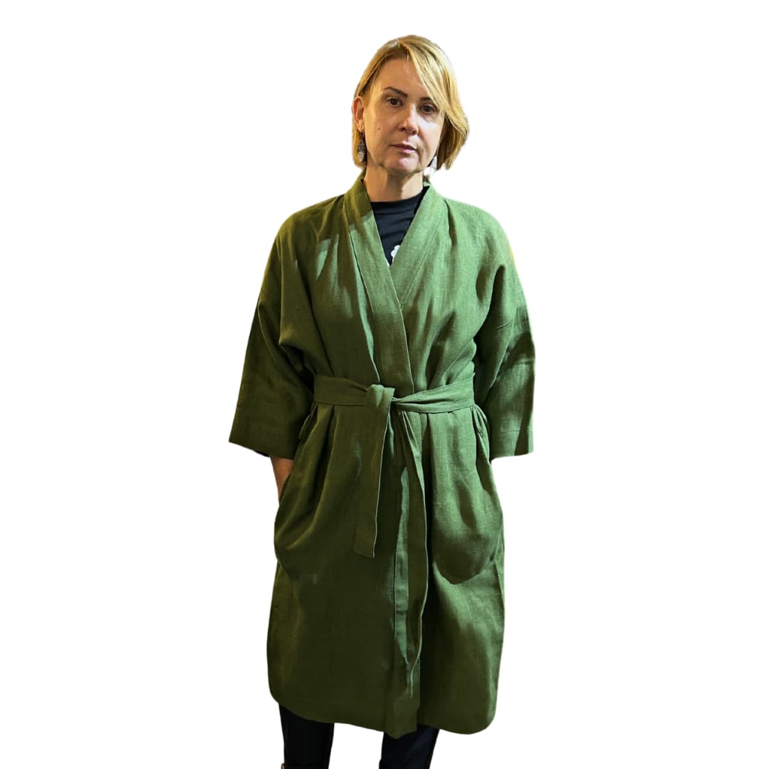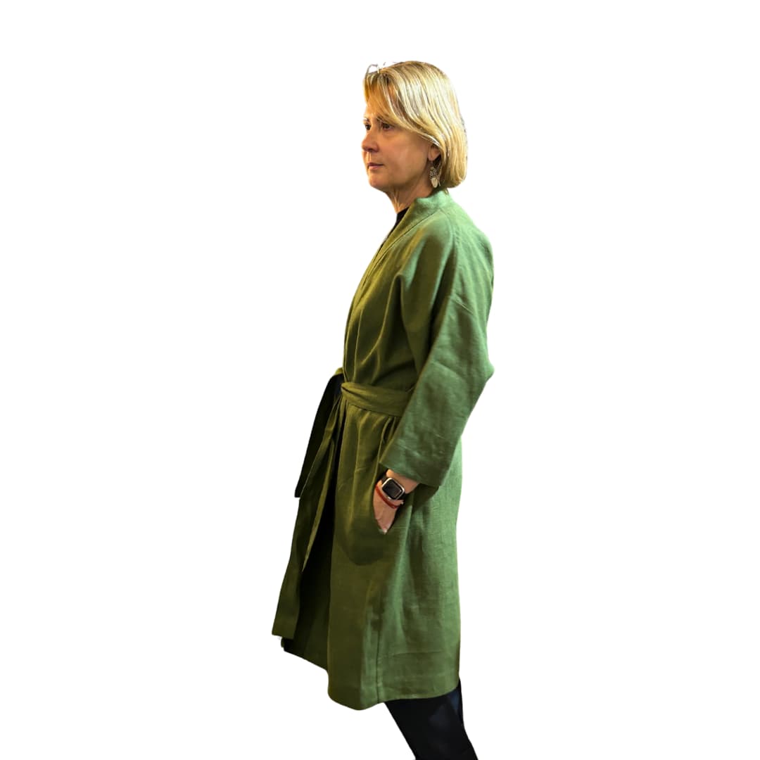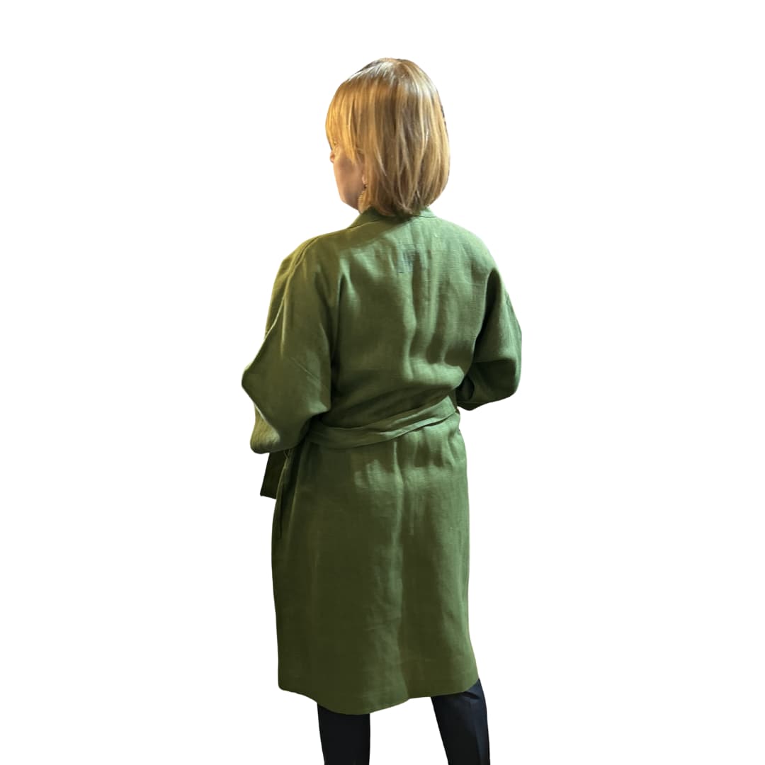 Kristi Mustkivi linane kimono – Roheline – Elegantne ja ajatu kimono, mis ühendab endas loomuliku ilu ja praktilisuse. See mudel on valmistatud tugevast linasest kangast, mis on vastupidav, hingav ja nahasõbralik – ideaalne igapäevaseks kandmiseks igal aastaajal.