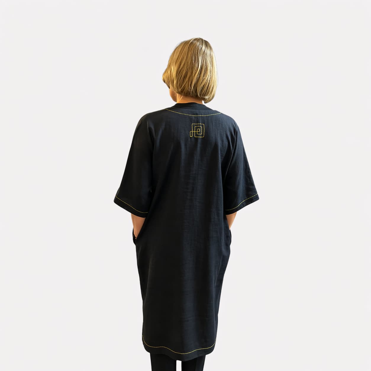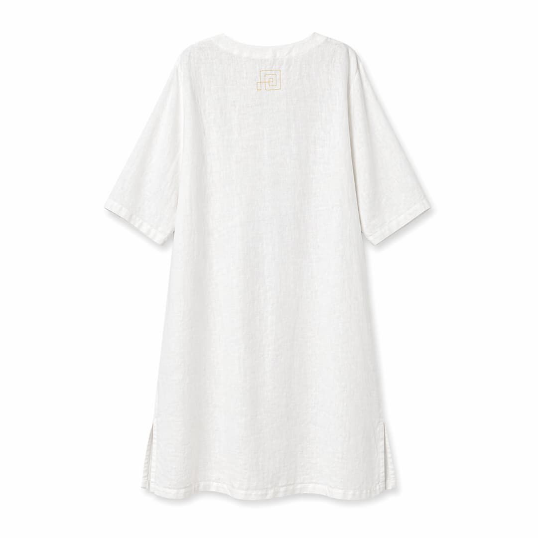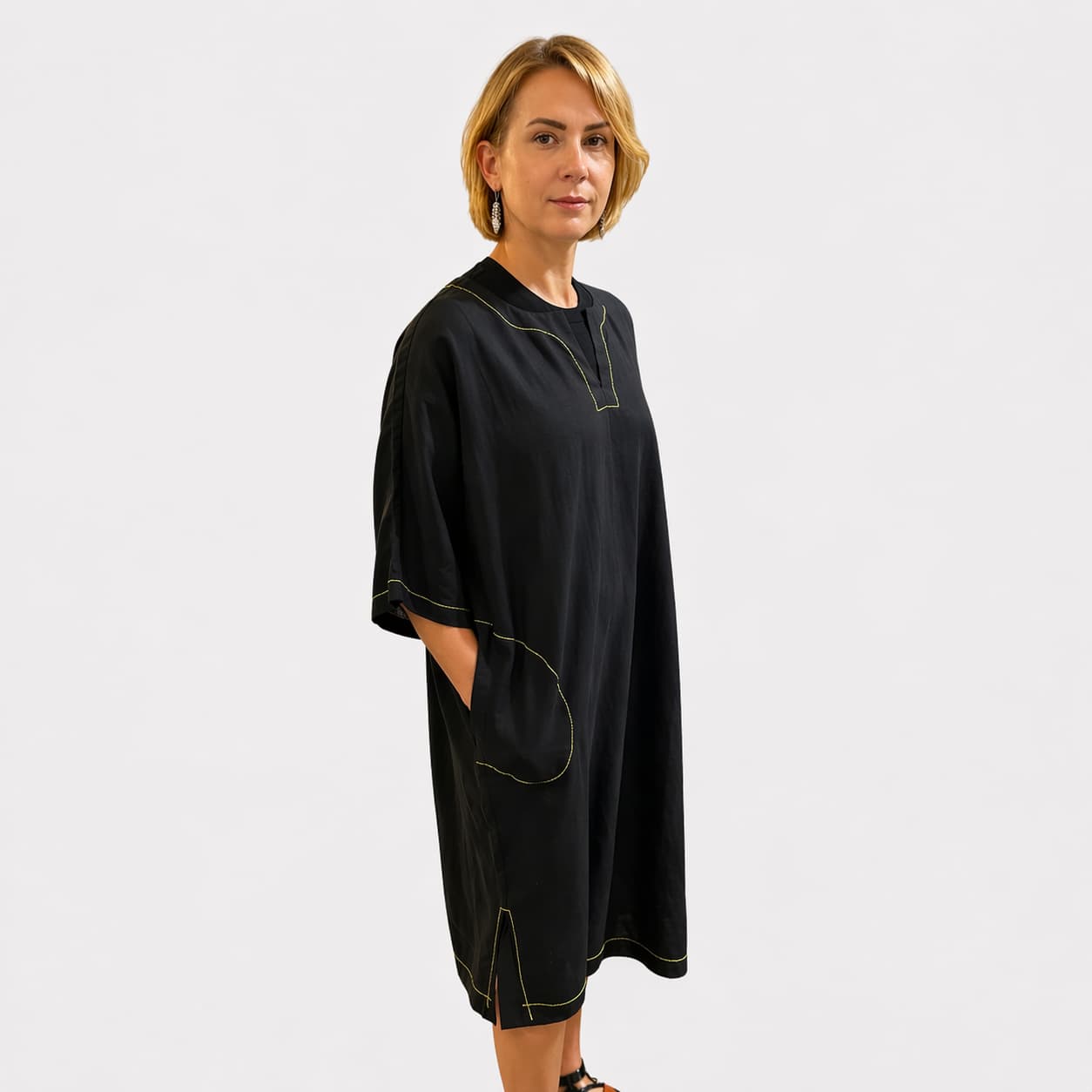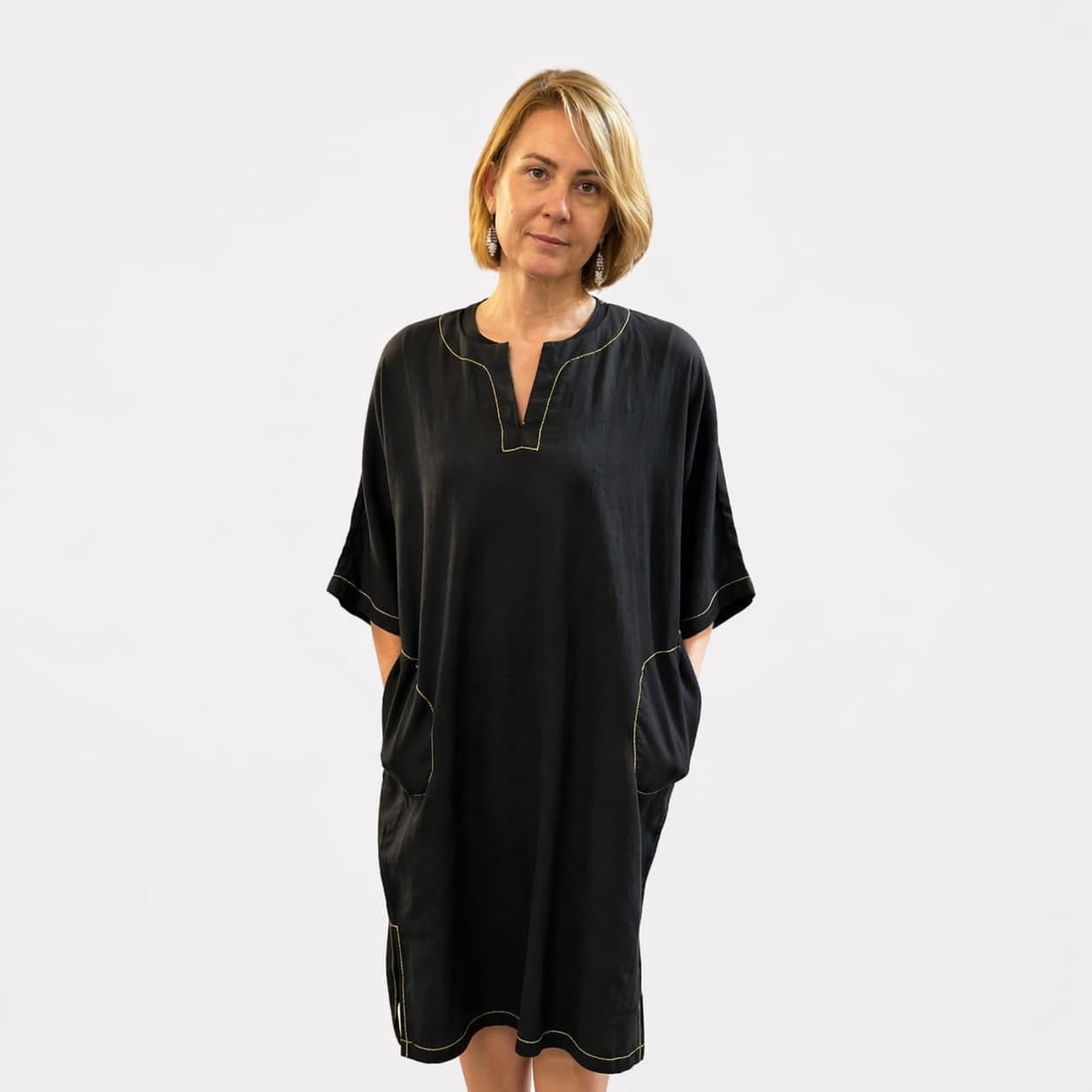 Vaba ja sirge lõige langeb kaunilt ning tagab liikumisvabaduse. Eesmine V-kujuline kaeluseava lisab disainile õrna aktsendi, samas kui küljelõhikud annavad lisamugavust ja õhulisust. Praktilised küljetaskud on diskreetselt peidetud, säilitades kleidi puhta ja tasakaalustatud ilme.