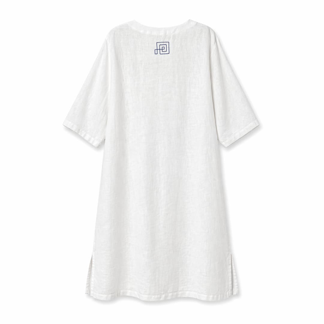 Kristi Mustkivi linane kleit – Valge/sinine – See minimalistlik linane kleit on loodud puhta joone ja maksimaalse mugavuse jaoks. 100% naturaalne lina on hingav, kerge ja nahasõbralik, muutes kleidi ideaalseks valikuks soojadeks suvepäevadeks.