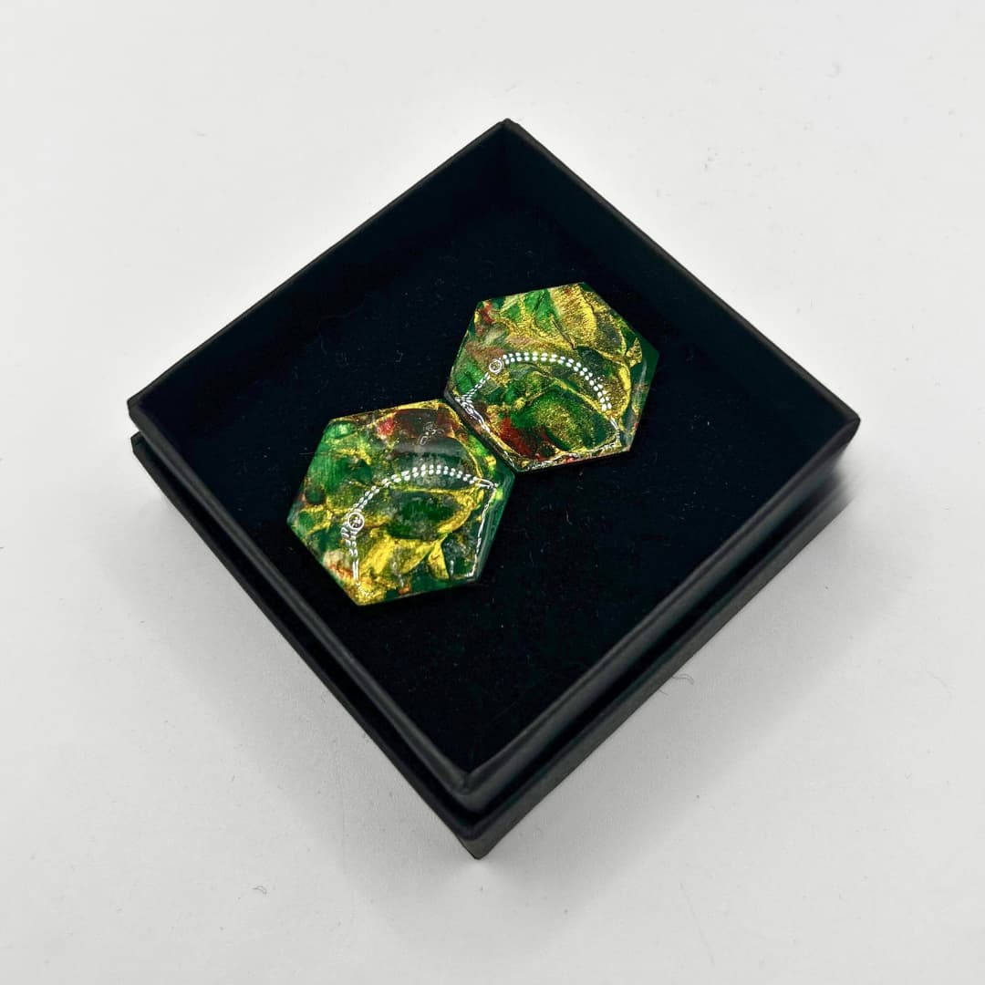 Liura kuusnurksed kõrvarõngad – Punakas-roheline – Kaunid, säravad ja pilkupüüdvad kõrvarõngad. Kõrvarõngad on kerged ning need on valmistatud Eestis.