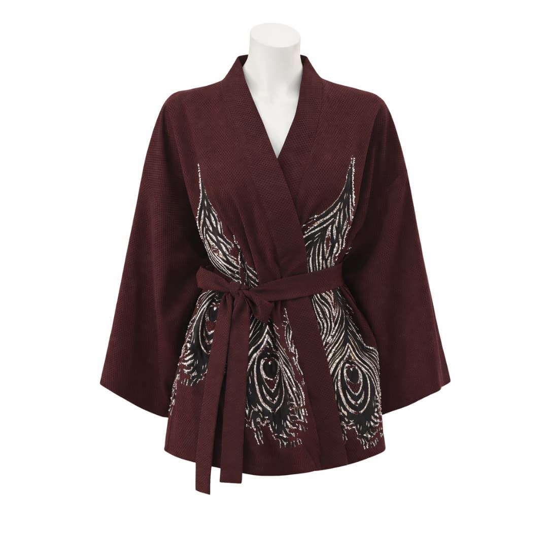 Moniik sätendav kimono – M/L – Elegantne ja pilkupüüdev kimono-stiilis jakk, mis ühendab klassikalise lõike ja luksusliku detaili. Sügav burgundipunane toon annab rõivale väärika ilme, samal ajal kui allääres ja esipaneelidel paiknev must-valge sätendav muster lisab glamuuri ja erilisust. Sädelus püüab valgust kaunilt ning muudab jaki ideaalseks nii pidulikumaks sündmuseks kui ka efektseks igapäevaseks stiilielemendiks.