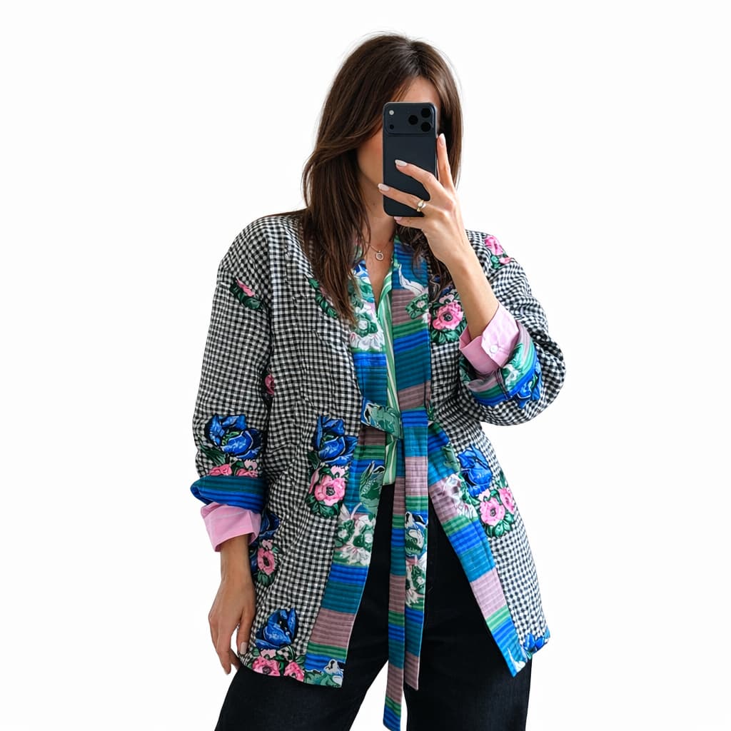 Must-valge jakk – Lilleline – Too oma garderoobi värvi ja iseloomu selle pilkupüüdva jakiga! Unikaalne disain ühendab klassikalise ruudumustri modernsete lillemotiivide ja värvikate detailidega, luues tõeliselt eristuva ja trendika terviku.