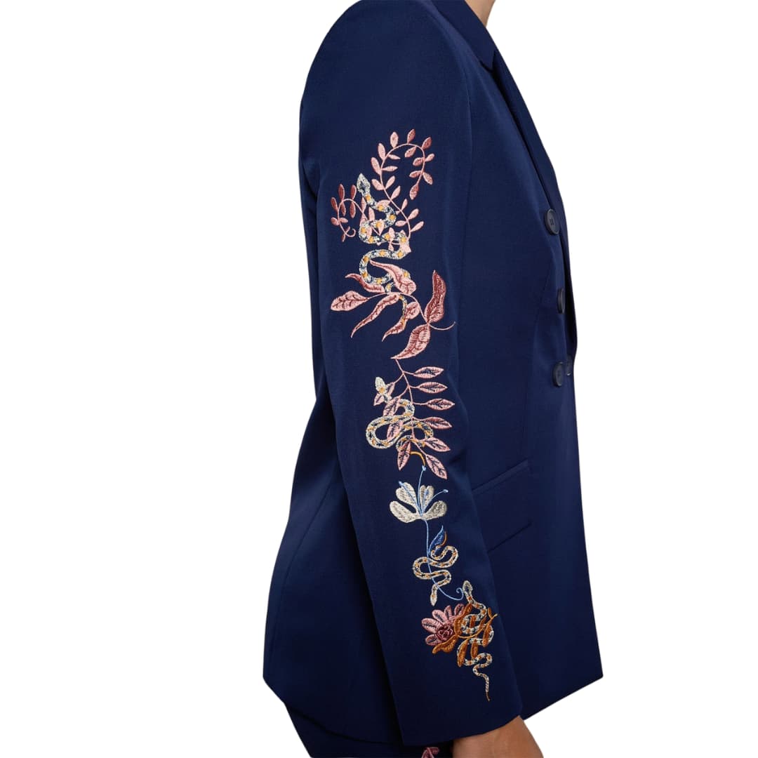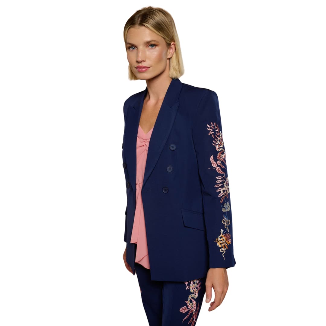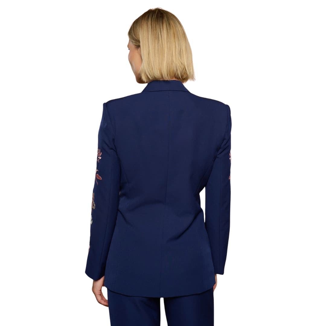 Naiste jakk Silene – Sinine – See pilkupüüdev tumesinine bleiser ühendab klassikalise rätsepatöö ja peene kunstilise detaili. Kahekordse nööbireaga lõige loob struktureeritud ja naiselikult elegantse silueti, samal ajal kui varrukaid kaunistav õrn tikand lisab jakile unikaalse ja luksusliku aktsendi.