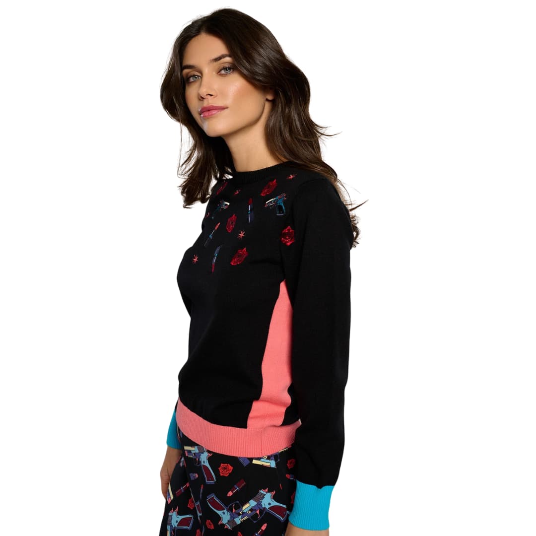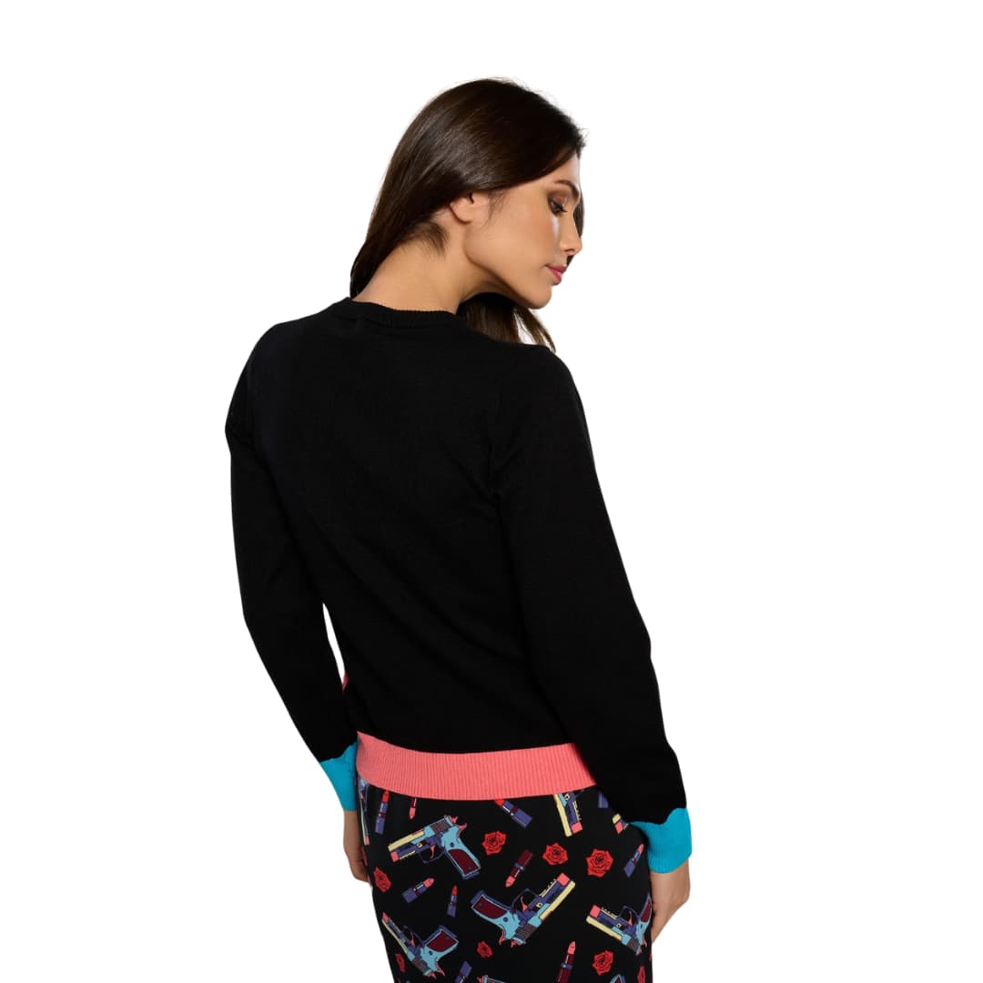 Naiste kampsun Zinerva – Must – Isikupärane ja pilkupüüdev kampsun, mis ühendab klassikalise musta põhitooni mänguliste ja julgete detailidega. Väikesed kontrastsed motiivid ning värvilised soonikud varrukatel ja allääres annavad kampsunile modernse ja kergelt särtsaka ilme. Sirge lõige ja ümar kaelus teevad sellest mugava valiku nii igapäevaseks kandmiseks kui ka stiilsemaks komplektiks.