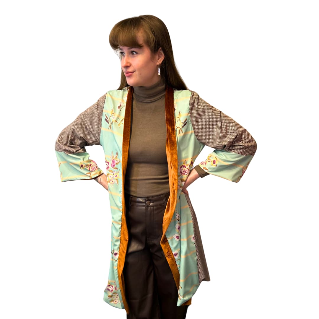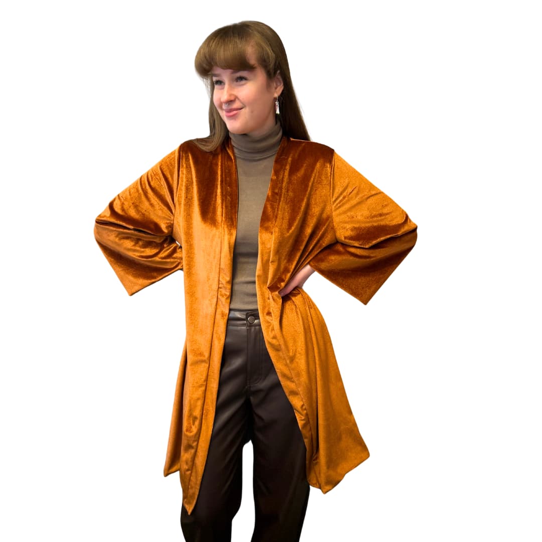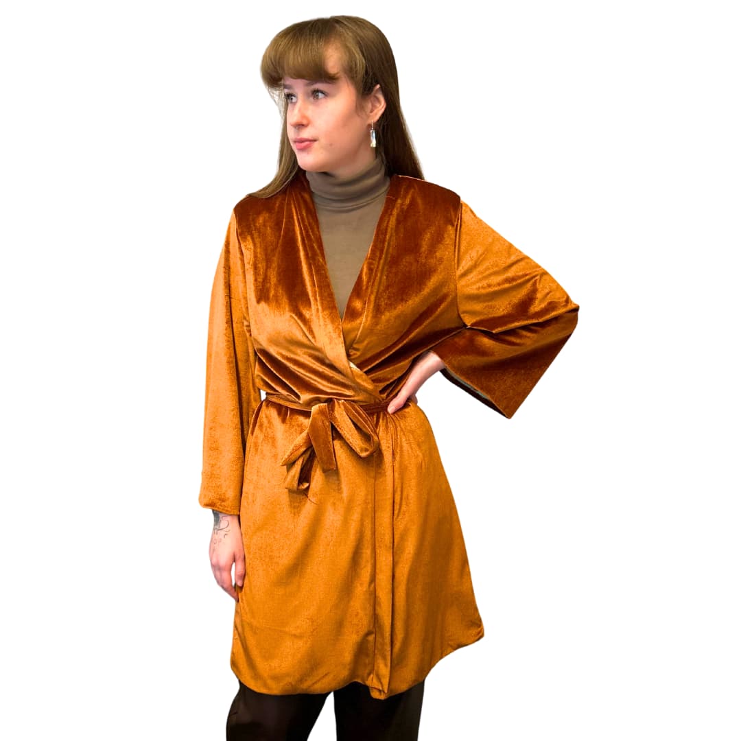 Naiste kimono/jakk Namaste – Oranž – See stiilne ja eriline kimono-jakk on loodud neile, kes armastavad mitmekülgsust ja mängulisust oma garderoobis. Pehme sametine pealispind annab luksusliku tunde, samas kui kontrastne sisekülg lisab karakterit ja võimaldab rõivast kanda kahtepidi – vastavalt tujule ja outfit’ile.