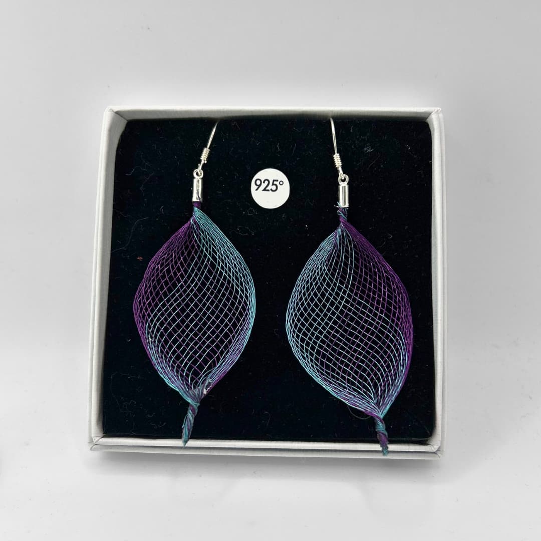 Soft Geometry kõrvarõngad – 02 – Käsitsi valmistatud õhuline võrgustruktuur loob skulpturaalse, kuid samas kerge ja liikuvad vormi, mis muutub koos valguse ja kandja liikumisega. Poolläbipaistev materjal laseb värvidel õrnalt seguneda ja vahetuda, andes ehetele sügavuse ja elavuse.