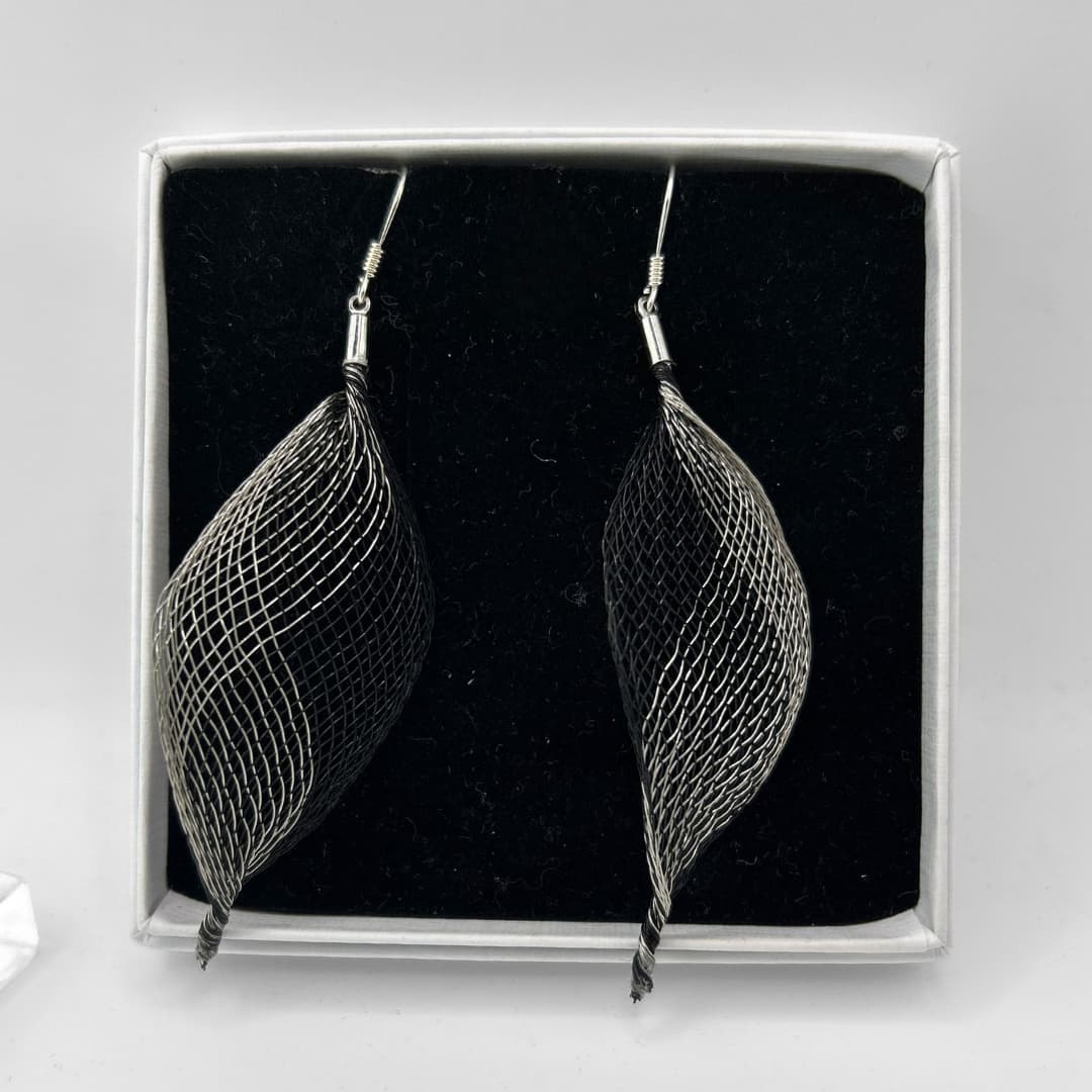 Soft Geometry kõrvarõngad – 03 – Käsitsi valmistatud õhuline võrgustruktuur loob skulpturaalse, kuid samas kerge ja liikuvad vormi, mis muutub koos valguse ja kandja liikumisega. Poolläbipaistev materjal laseb värvidel õrnalt seguneda ja vahetuda, andes ehetele sügavuse ja elavuse.