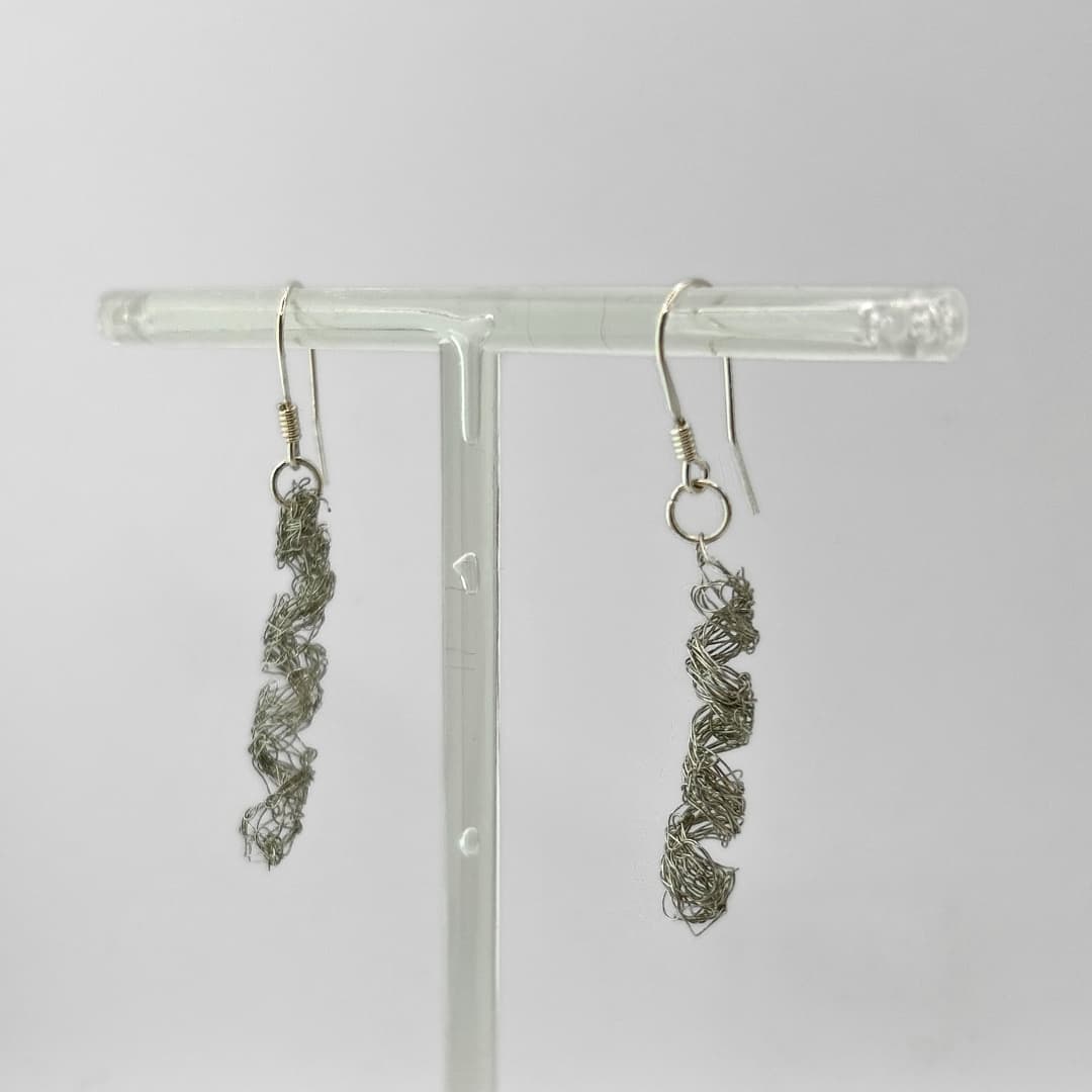 Soft Geometry kõrvarõngad – 04 – Käsitsi valmistatud õhuline võrgustruktuur loob skulpturaalse, kuid samas kerge ja liikuvad vormi, mis muutub koos valguse ja kandja liikumisega. Poolläbipaistev materjal laseb värvidel õrnalt seguneda ja vahetuda, andes ehetele sügavuse ja elavuse.