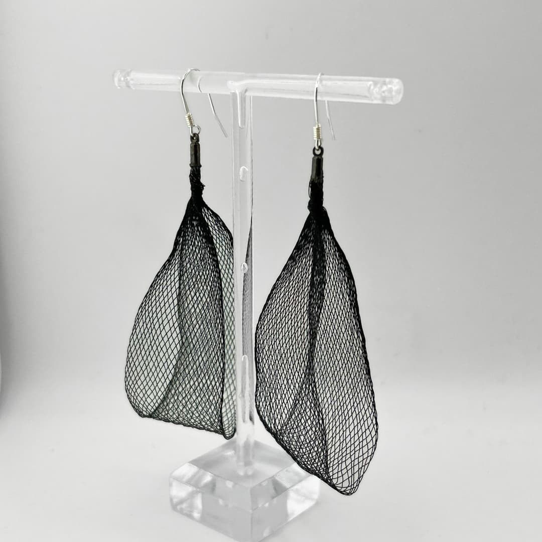 Soft Geometry kõrvarõngad – 14 – Käsitsi valmistatud õhuline võrgustruktuur loob skulpturaalse, kuid samas kerge ja liikuvad vormi, mis muutub koos valguse ja kandja liikumisega. Poolläbipaistev materjal laseb värvidel õrnalt seguneda ja vahetuda, andes ehetele sügavuse ja elavuse.