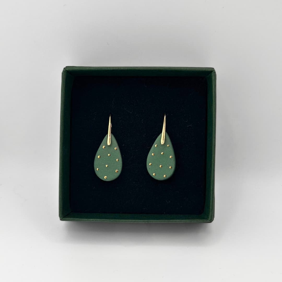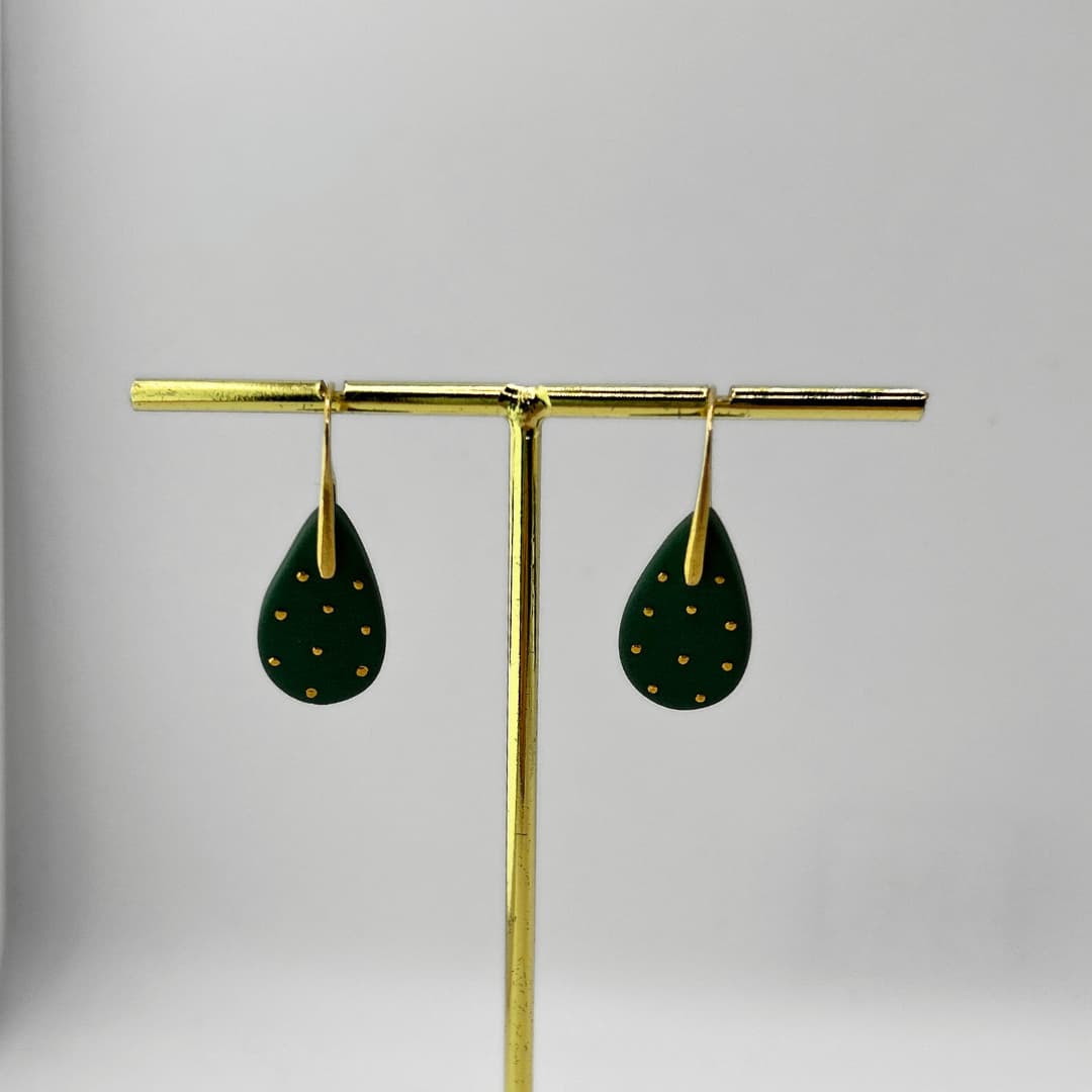 Stuudio Ankoopi kõrvarõngad – Rohelised täppidega – Keraamilised käsitööna valmistatud kõrvarõngad, millel on 925 hõbe või kullatud hõbe kinnised.