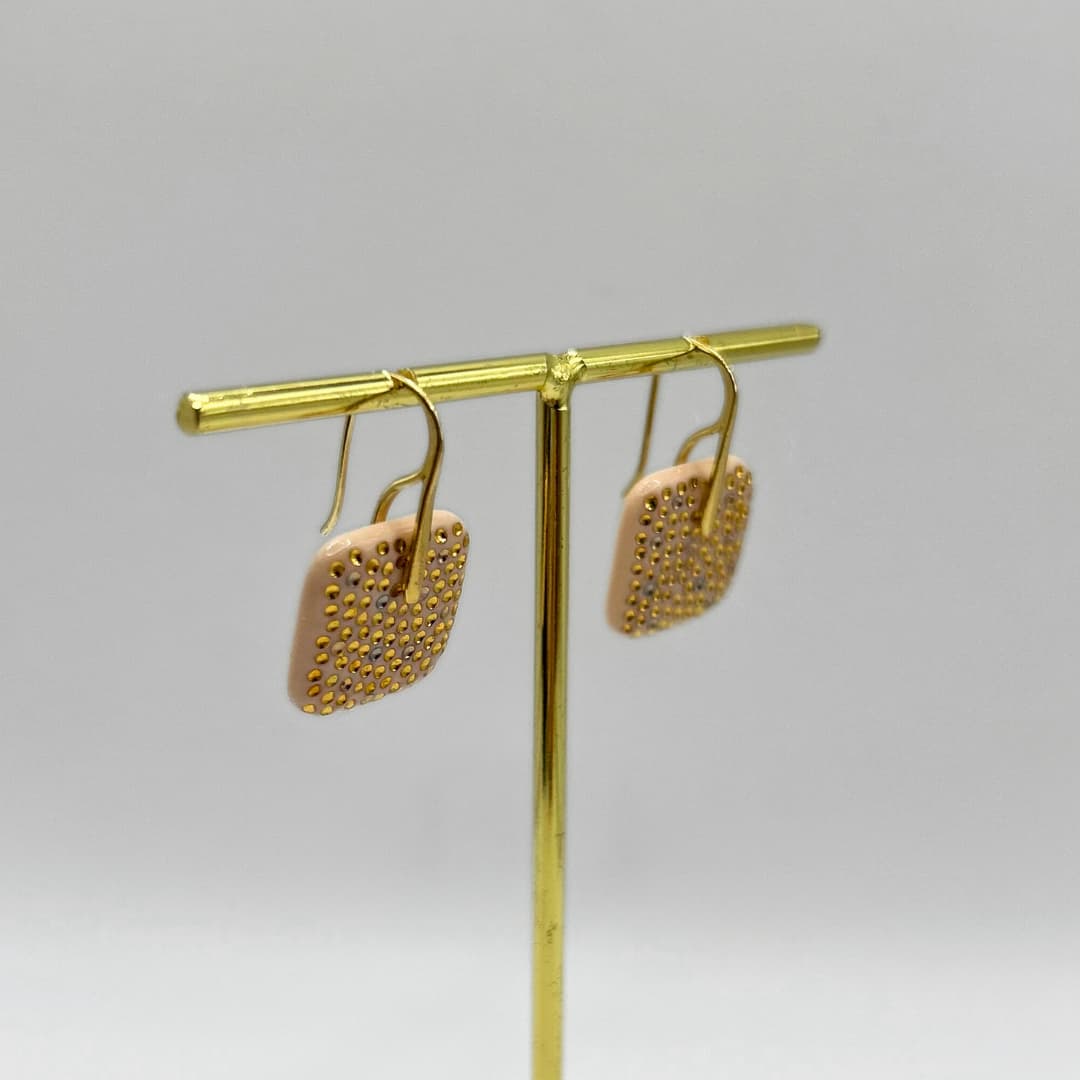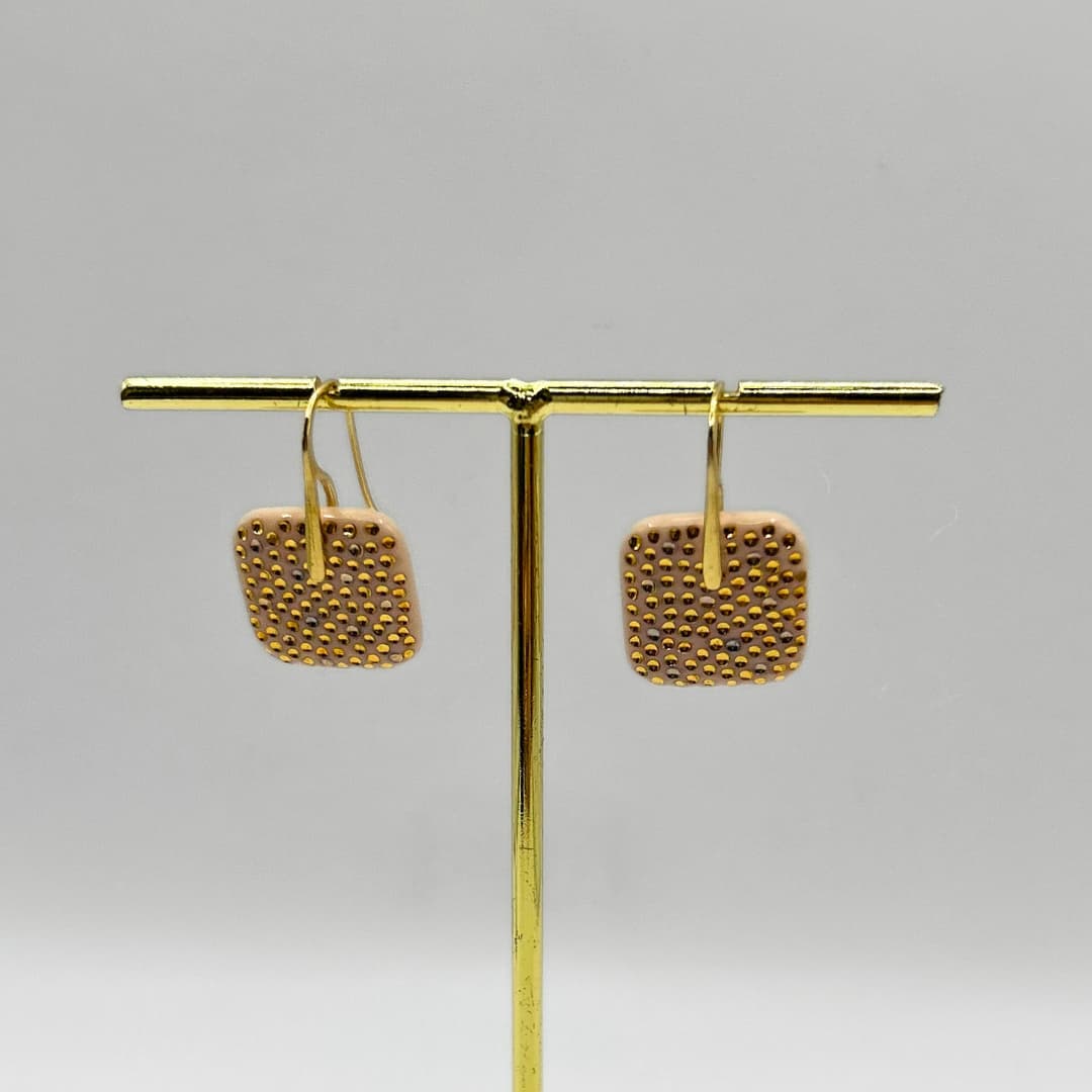 Stuudio Ankoopi kõrvarõngad – Roosad ruudud kuldsete täppidega – Keraamilised käsitööna valmistatud kõrvarõngad, millel on 925 hõbe või kullatud hõbe kinnised.