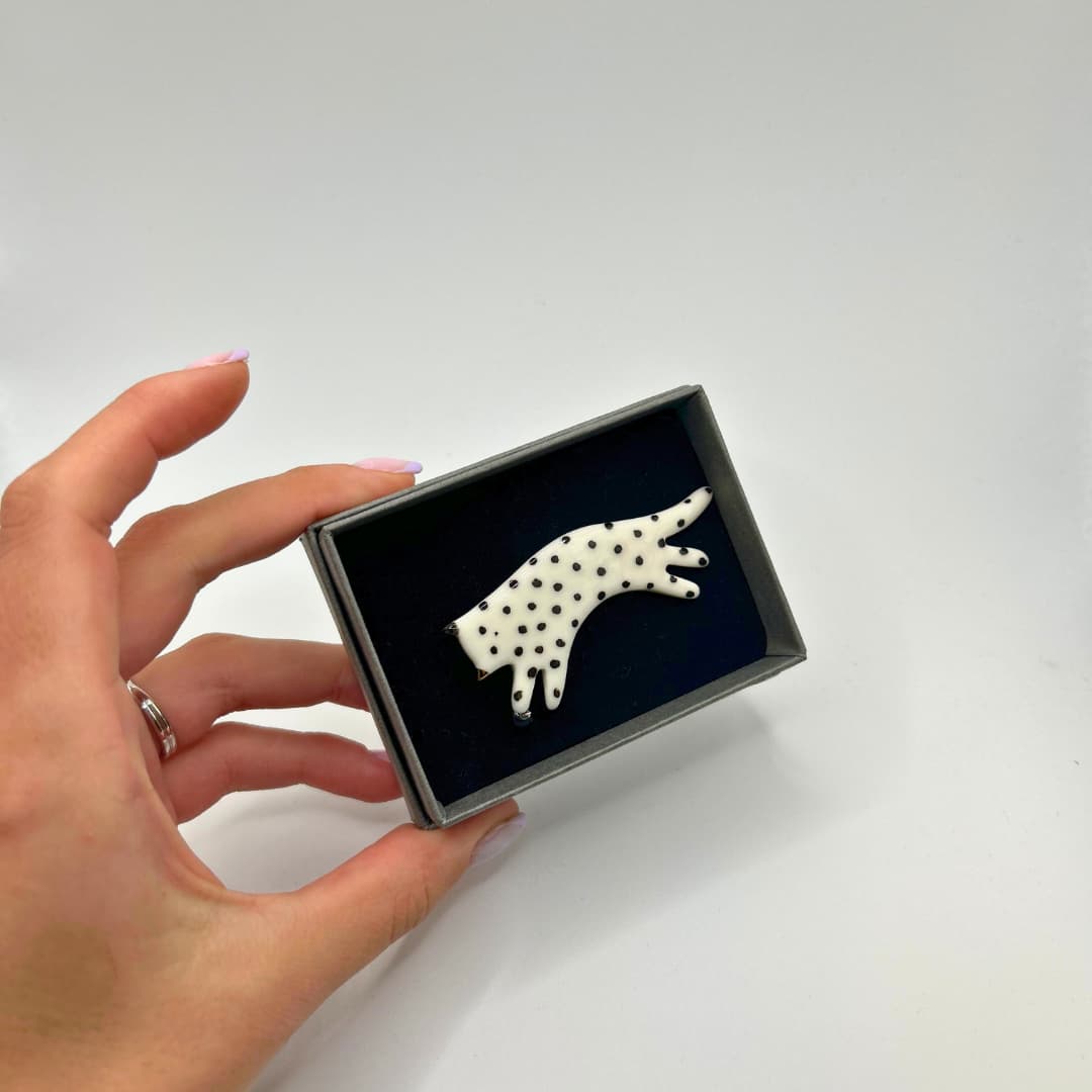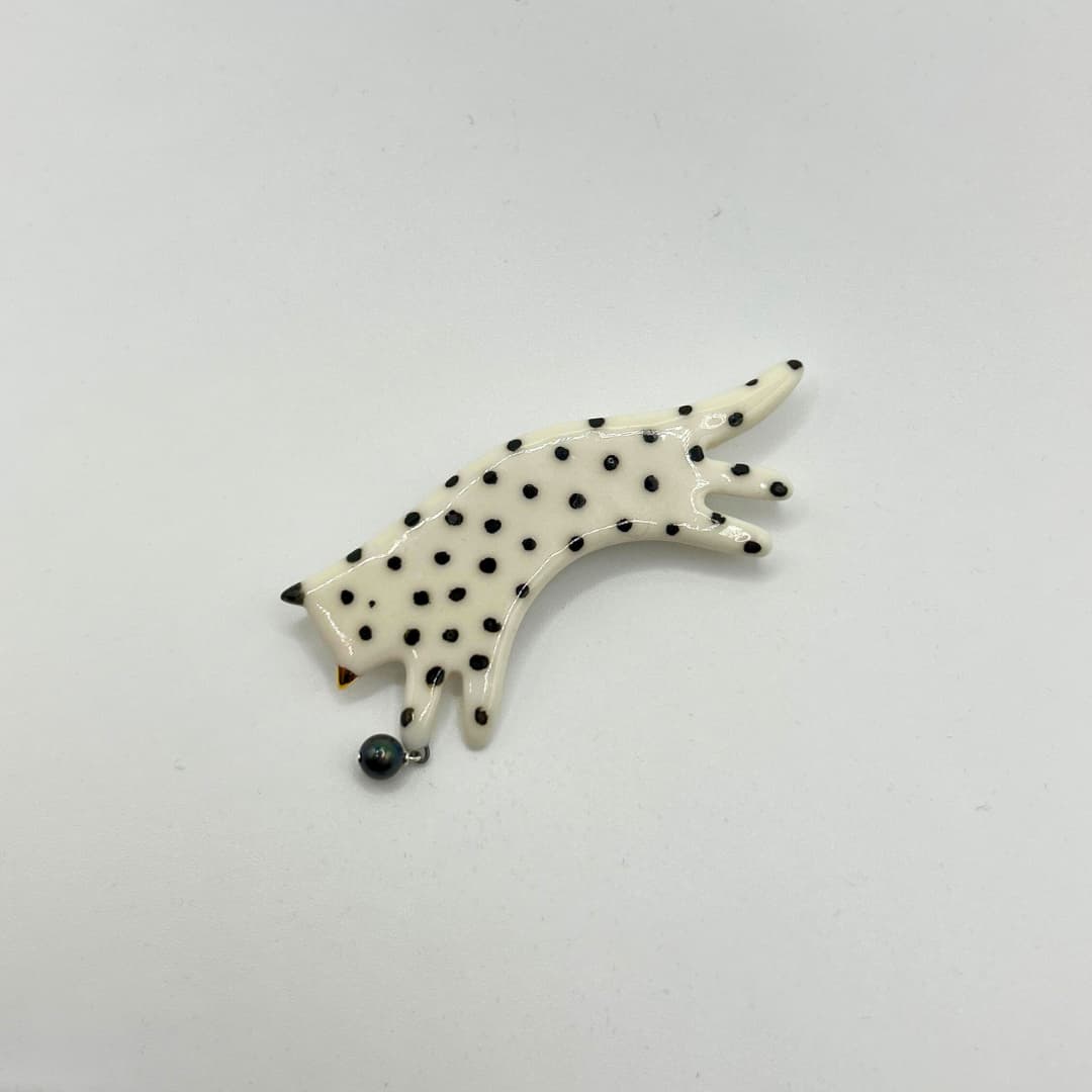 Stuudio Ankoopi – Valge kass mustade täppidega – Käsitsi valmistatud keraamiline pross.