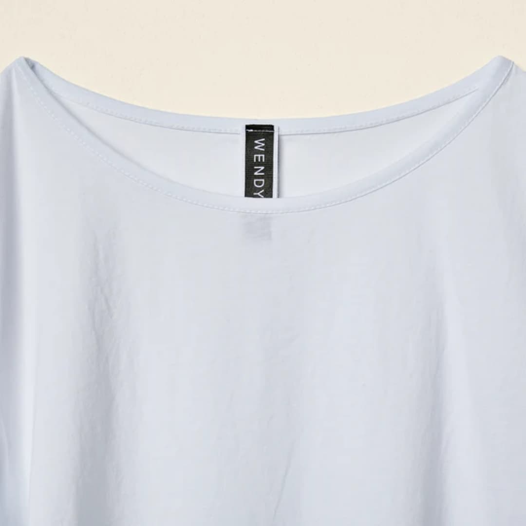 Pluusi eriliseks detailiks on pikendatud, teravatipuline alläär, mida täiendab peen sidumisdetail – see lisab rõivale mängulisust ja võimaldab välimust veidi varieerida. Lühikesed varrukad ja klassikaline ümar kaelus loovad ajatu baasi, mida on lihtne sobitada erinevate stiilidega.