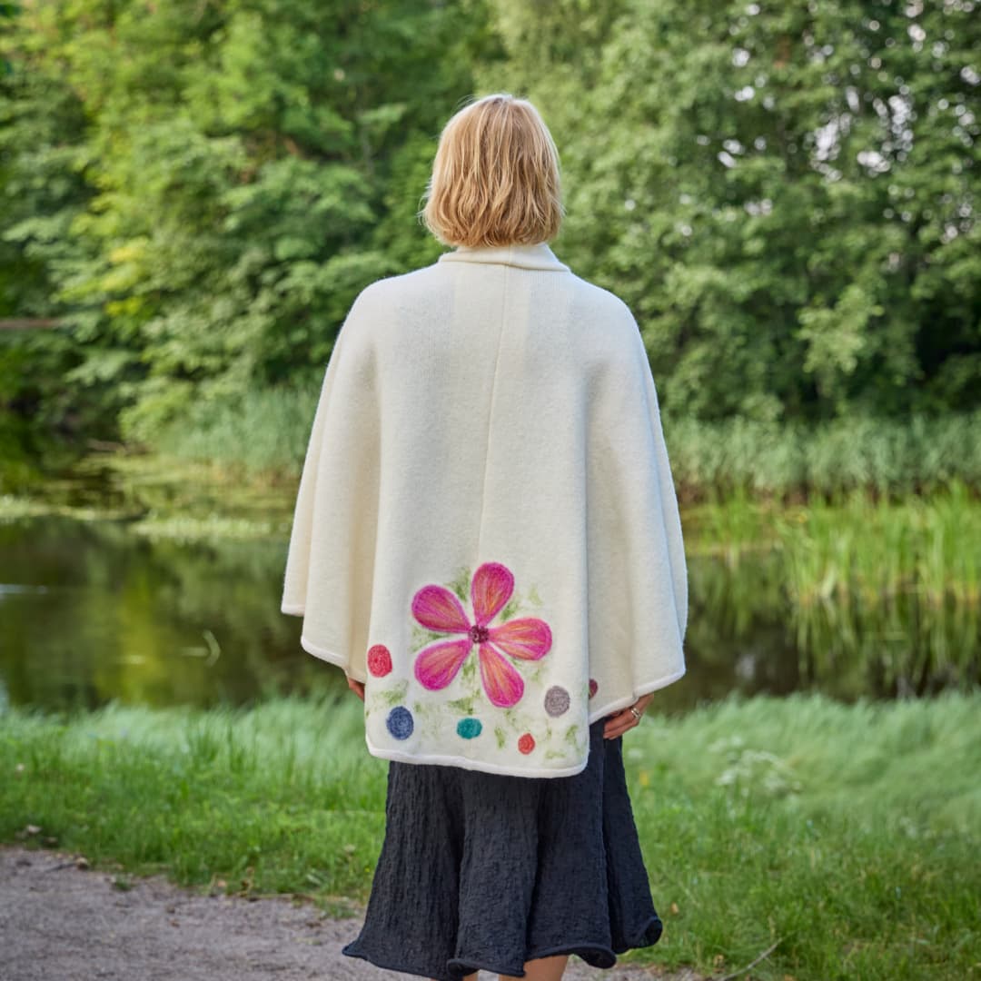 Villane pontšo – Valge lilledega – 100% villane pontšo – valmistatud Eestis.